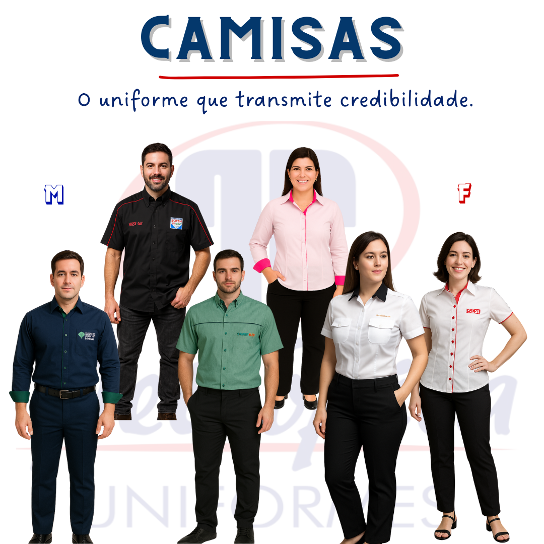 Camisas profissionais personalizadas em modelos masculinos e femininos, ideais para empresas que buscam transmitir credibilidade e sofisticação. Disponíveis em várias cores e estilos.