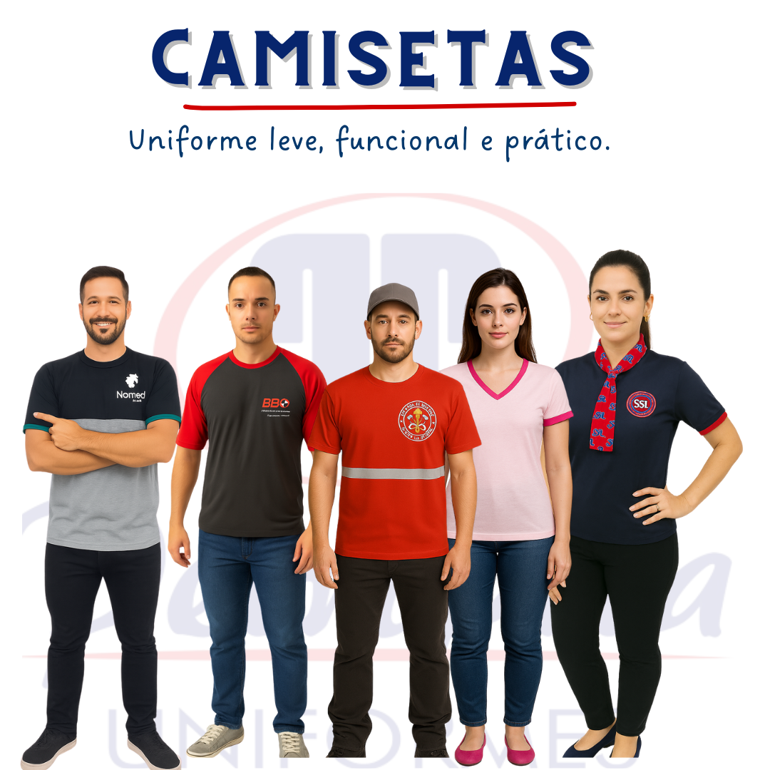 Camisetas profissionais personalizadas, ideais para empresas que buscam uniformes leves, práticos e funcionais. Modelos masculinos e femininos em várias cores e estilos.